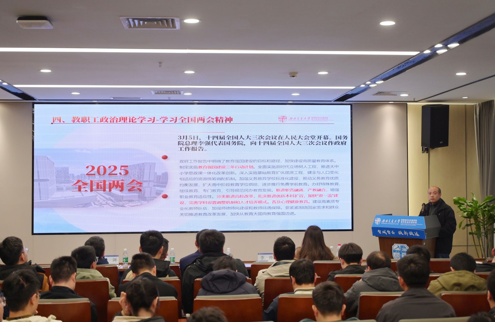 开展教职工政治理论学习。李涛领学全国两会精神、学校2025年全面从严治党工作要点、贯彻中央八项规定精神学习教育精神、科研诚信与保密工作。