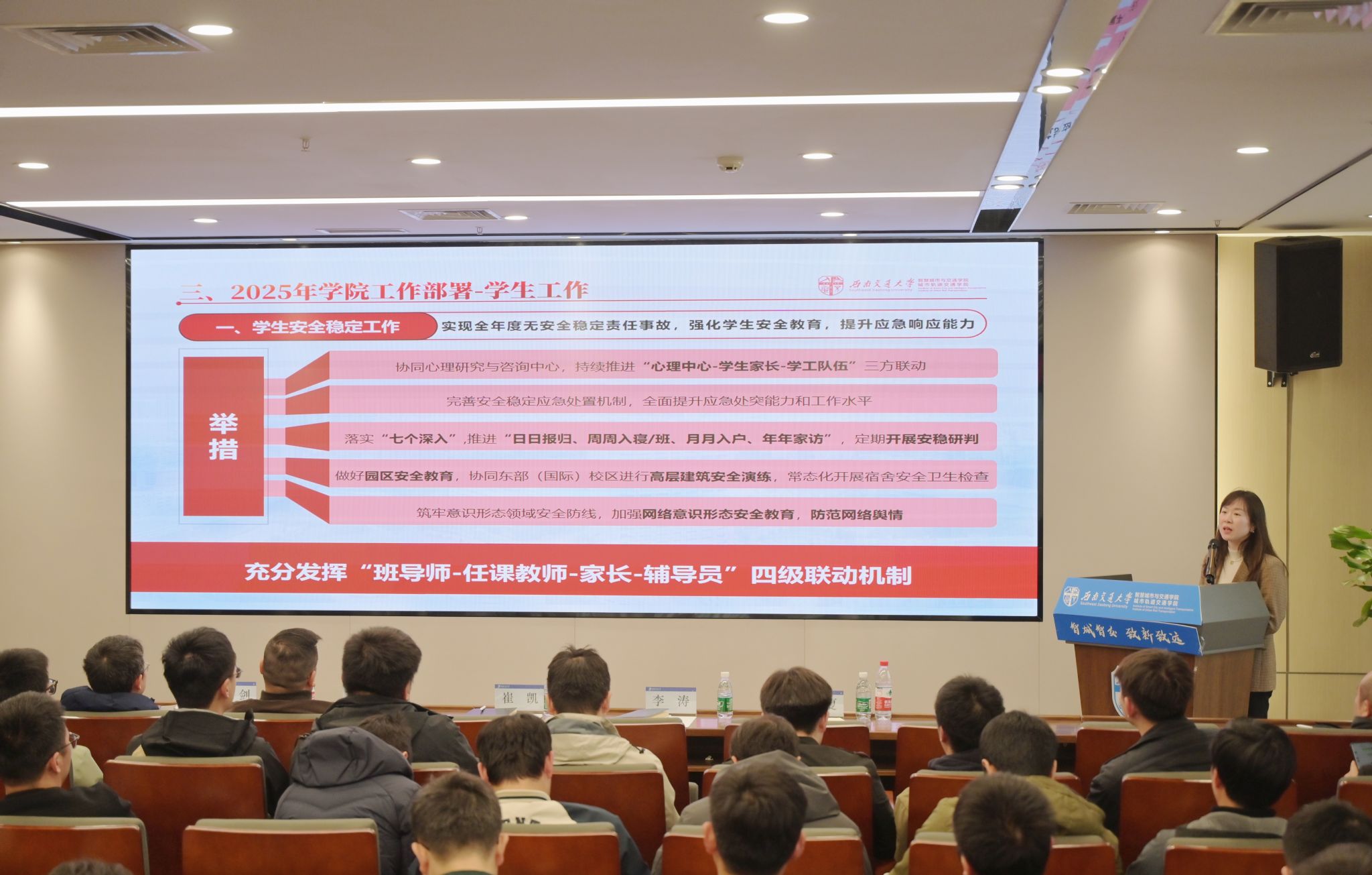 夏夏从学生安全稳定工作、校区搬迁工作、高质量就业工作、学生工作一流建设四部分汇报部署了2025年加拿大28开奖