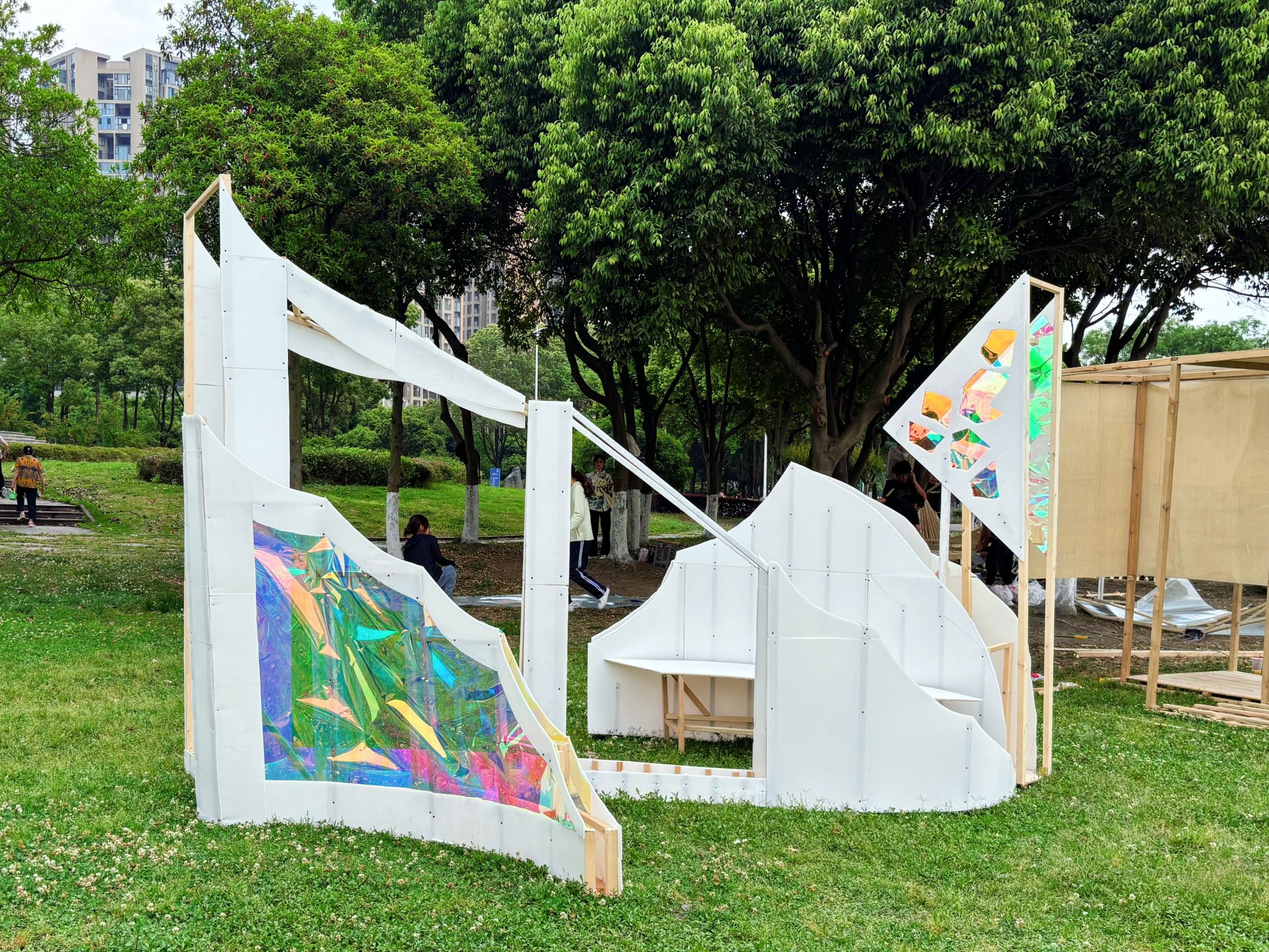 实操上,我们学会切割拼接板材,研究连接件的适配,确保结构稳固;彩色反光材料运用上,经多场景测试调整,实现不同时段的不同光影效果,同时,在从模型到实体搭建的过程中,我们对空间尺度、比例关系的把握能力显著提升,深化了我们的空间思维。