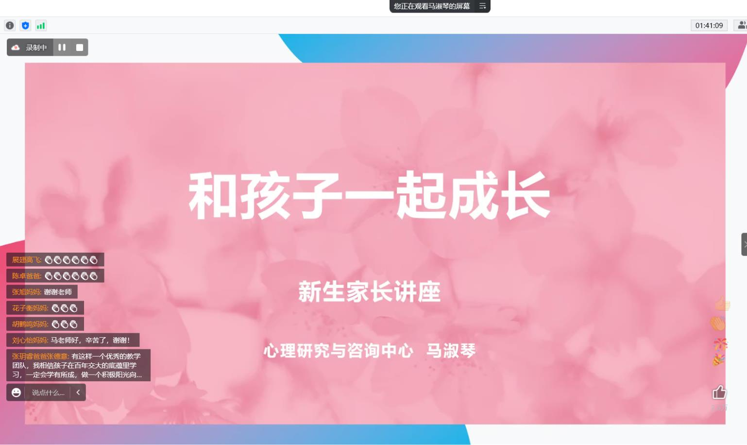马淑琴以《和孩子一起成长》为主题,从理论和实际相结合的方式分享了学生和家长沟通的案例,希望家长能够理解、尊重、支持和帮助孩子,和孩子一起成长。