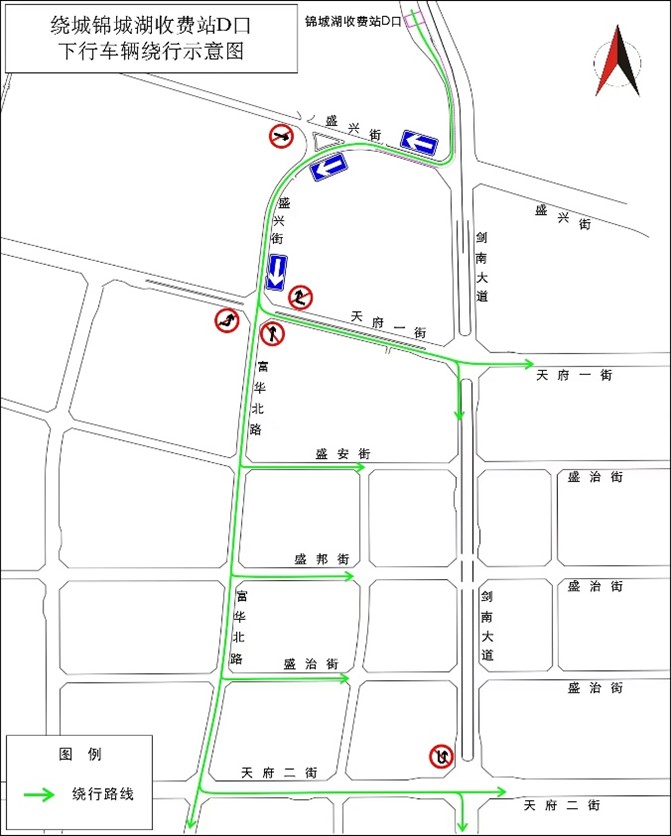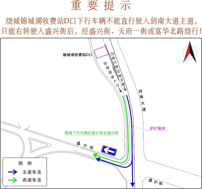 A:前段时间刚实施的是优化方案中锦城湖收费站下行方向车辆绕行的交通组织调整,其主要目的是缓解剑南大道主道与绕城高速下行两股车流交织产生的交通拥堵问题。方案使绕城高速下行车流经盛兴街、富华北路绕行,可在缓解车流交织问题的同时提高次干路、支路的道路利用率,均衡路网车流。