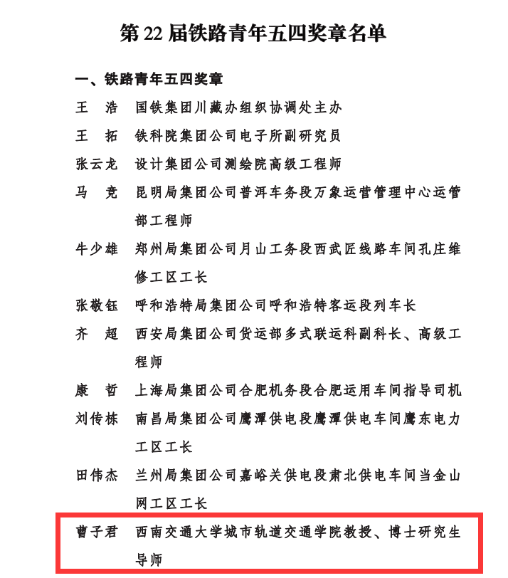 青年教师曹子君教授荣获第22届铁路青年五四奖章(全国共13名、高校唯一)。