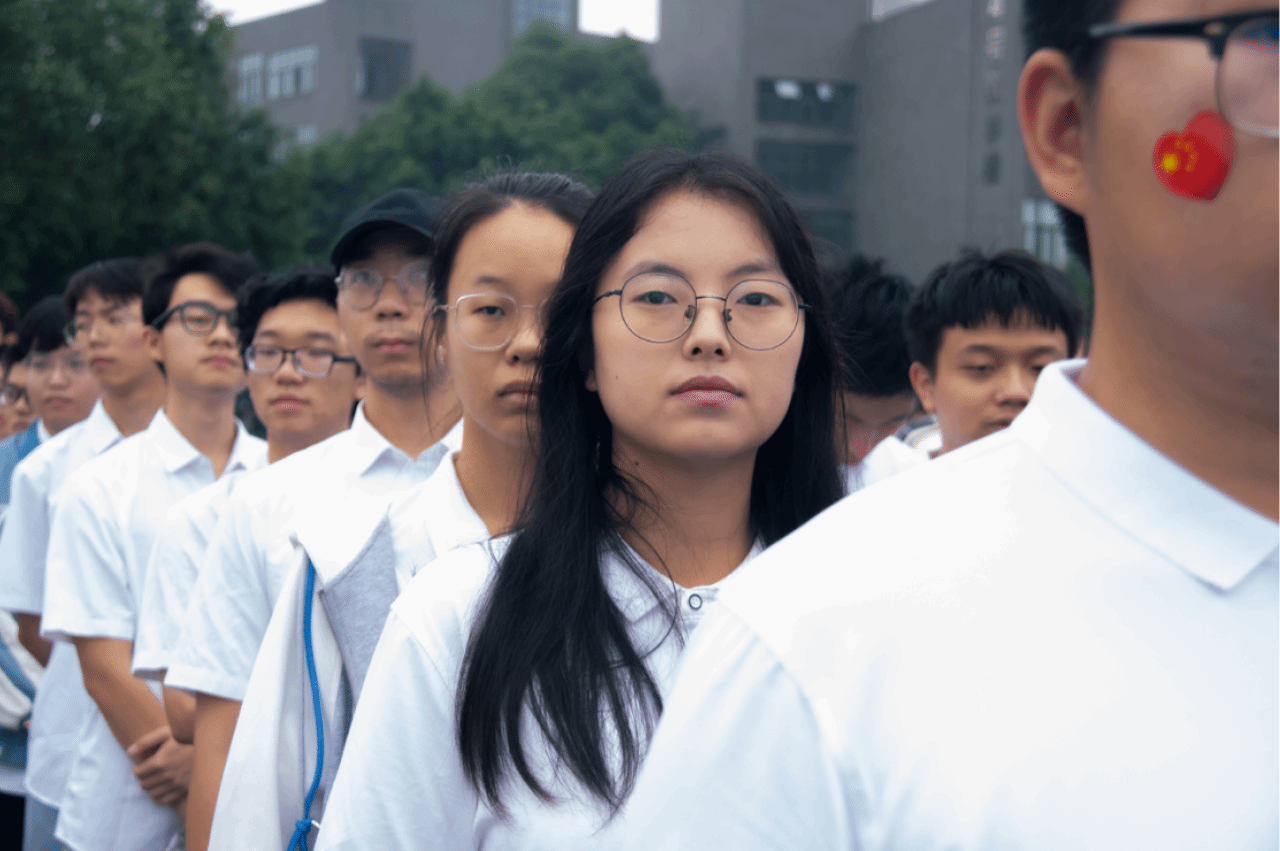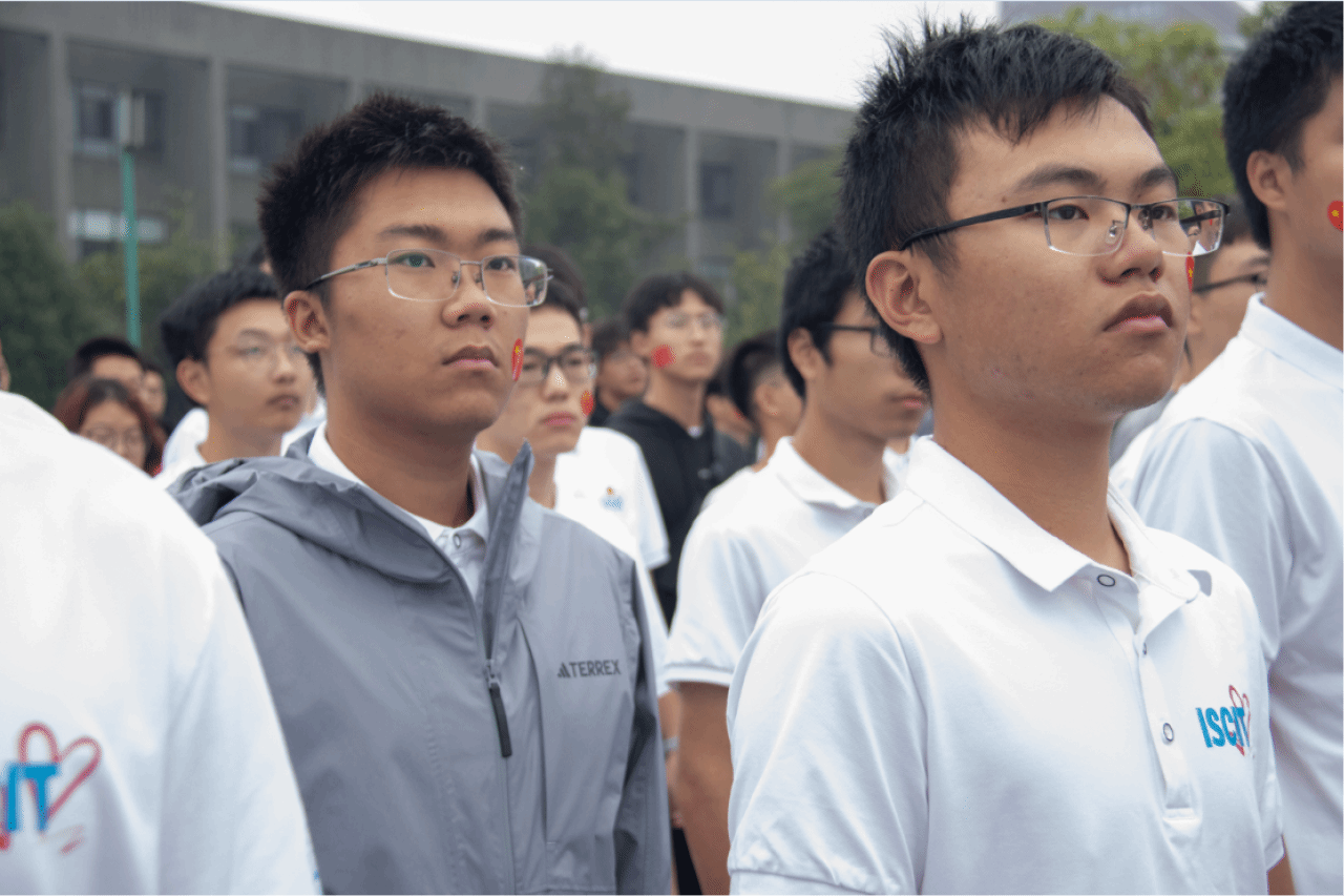 师生身着文化衫,党员、团员同志佩戴党员徽章、团徽,深情地唱出对祖国的清澈爱恋。在红旗的映衬下,交大校园生机盎然,智慧学子斗志昂扬。