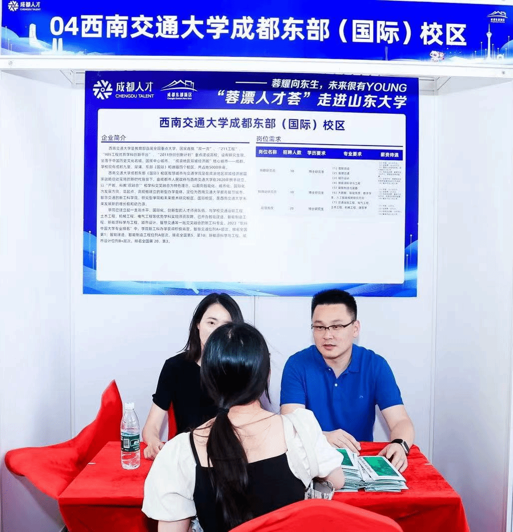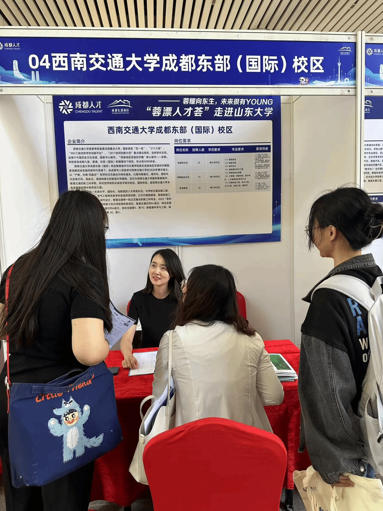 人才招聘工作小组赴山东大学参加由成都市委人才办主办、成都东部新区党工委人才办、简阳市委人才办、天府新区眉山党工委人才办、资阳市临空经济区党工委人才办承办的“蓉漂人才荟”走进山东大学系列活动,集中招引优秀人才。