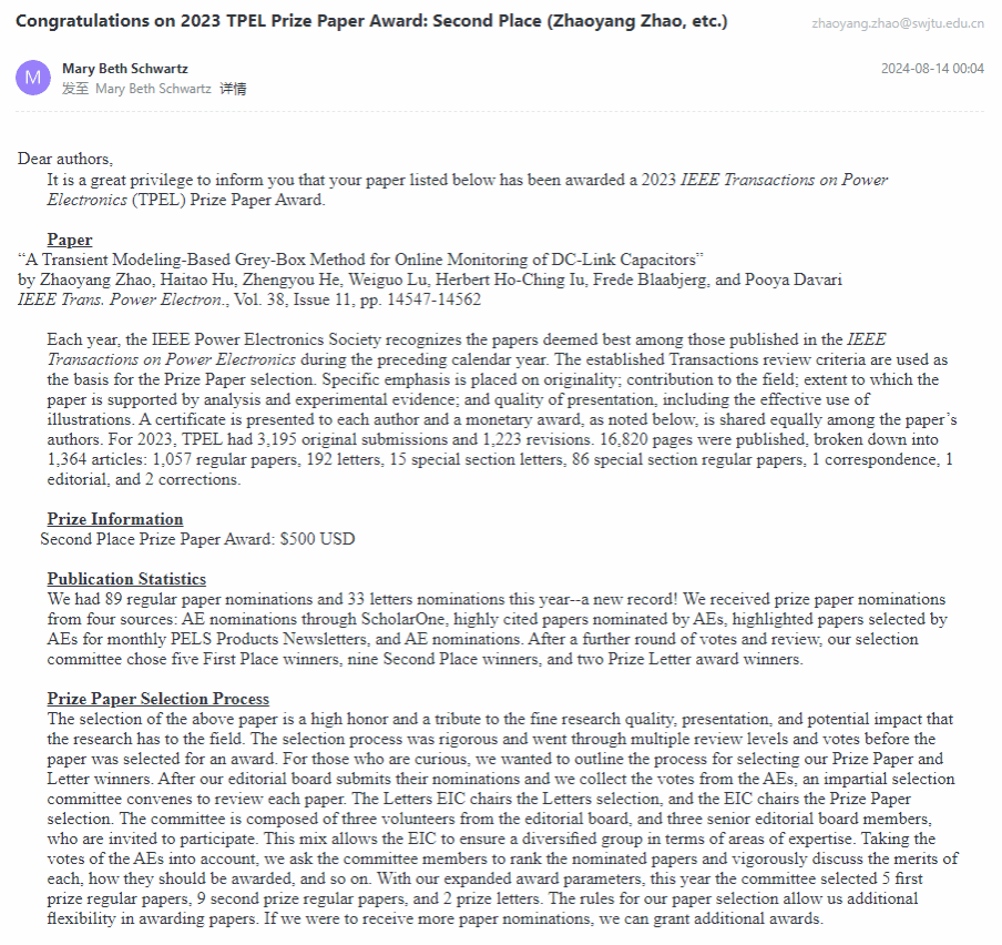 近日,IEEE电力电子学会(Power Electronics Society, PELS)公布了旗舰期刊IEEE Transactions on Power Electronics (TPEL)2023年度优秀论文奖(Prize Paper Award)获奖名单。从该刊2023年度正式出版的1364篇论文中评选出一等奖(First Place Prize Paper)5篇、二等奖(Second Place Prize Paper)9篇和优秀快报(Prize Letter)2篇。何正友教授团队论文《A Transient Modeling-Based Grey-Box Method for Online Monitoring of DC-Link Capacitors》荣获2023年度优秀论文二等奖。论文第一/通讯单位均为西南交通大学,加拿大28开奖