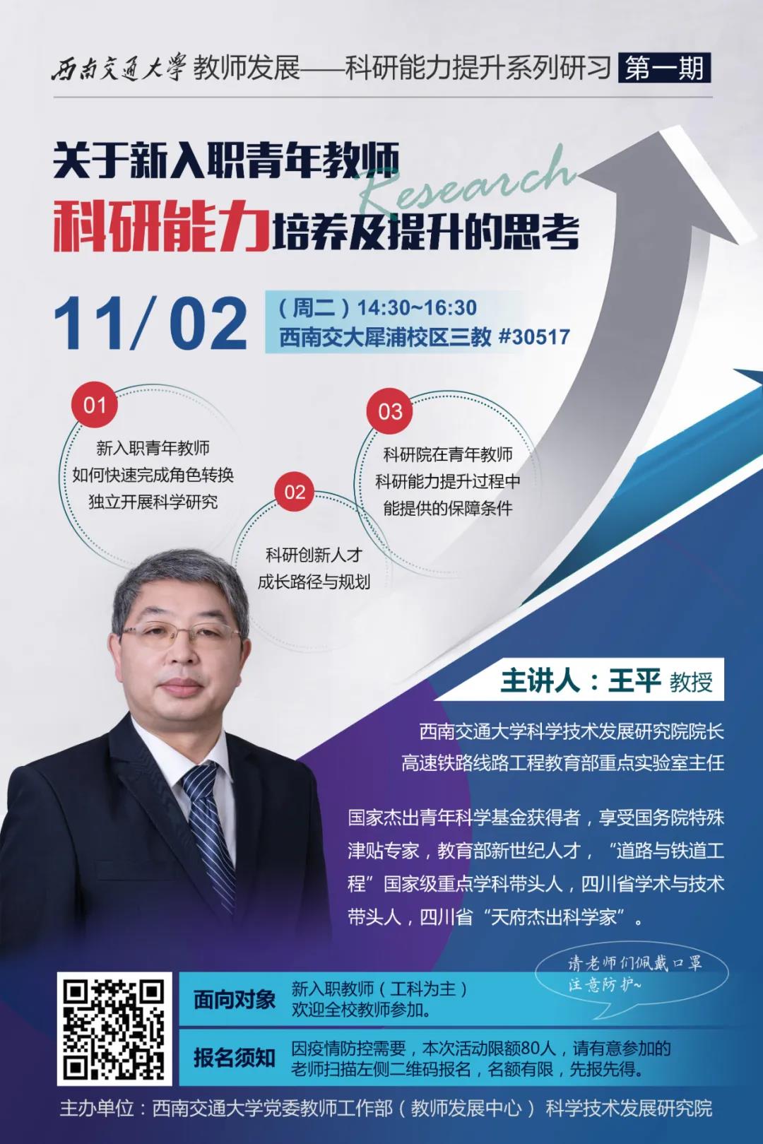 王平,西南交通大学科学技术发展研究院院长,高速铁路线路工程教育部重点实验室主任,教授,博导。国家杰出青年科学基金获得者,享受国务院特殊津贴专家,教育部新世纪人才,“道路与铁道工程”国家级重点学科带头人,四川省学术与技术带头人,四川省“天府杰出科学家”。