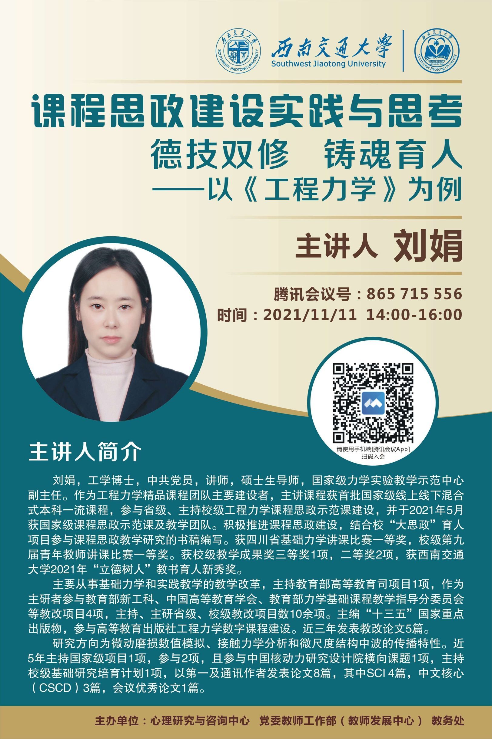 刘娟,工学博士,中共党员,讲师,硕士生导师,国家级力学实验教学示范中心副主任。作为工程力学精品课程团队主要建设者,主讲课程获首批国家级线上线下混合式本科一流课程,参与省级、主持校级工程力学课程思政示范课建设,并于2021年5月获国家级课程思政示范课及教学团队。积极推进课程思政建设,结合校“大思政”育人项目参与课程思政教学研究的书稿编写。获四川省基础力学讲课比赛一等奖,校级第九届青年教师讲课比赛一等奖。获校级教学成果奖三等奖1项,二等奖2项,获西南交通大学2021年“立德树人”教书育人新秀奖。