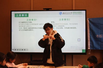 此外,学生们在实践队员的引导下,亲自动手制作盐水动力小车和磁悬浮列车模型。通过讲解与实操,学生们了解到镁片与碳片在盐水中发生氧化还原反应从而产生电流,以及磁悬浮技术的基本原理,进一步加深了对新工科知识的理解。自动灌溉装置的组装课程将科技与农业相结合,让学生们了解科技在农业领域的实际应用价值。学生们在实践中学习了湿度传感器、继电器等基本元件的使用,组装出简易的自动灌溉装置,体会科技对农业生产的助力作用。