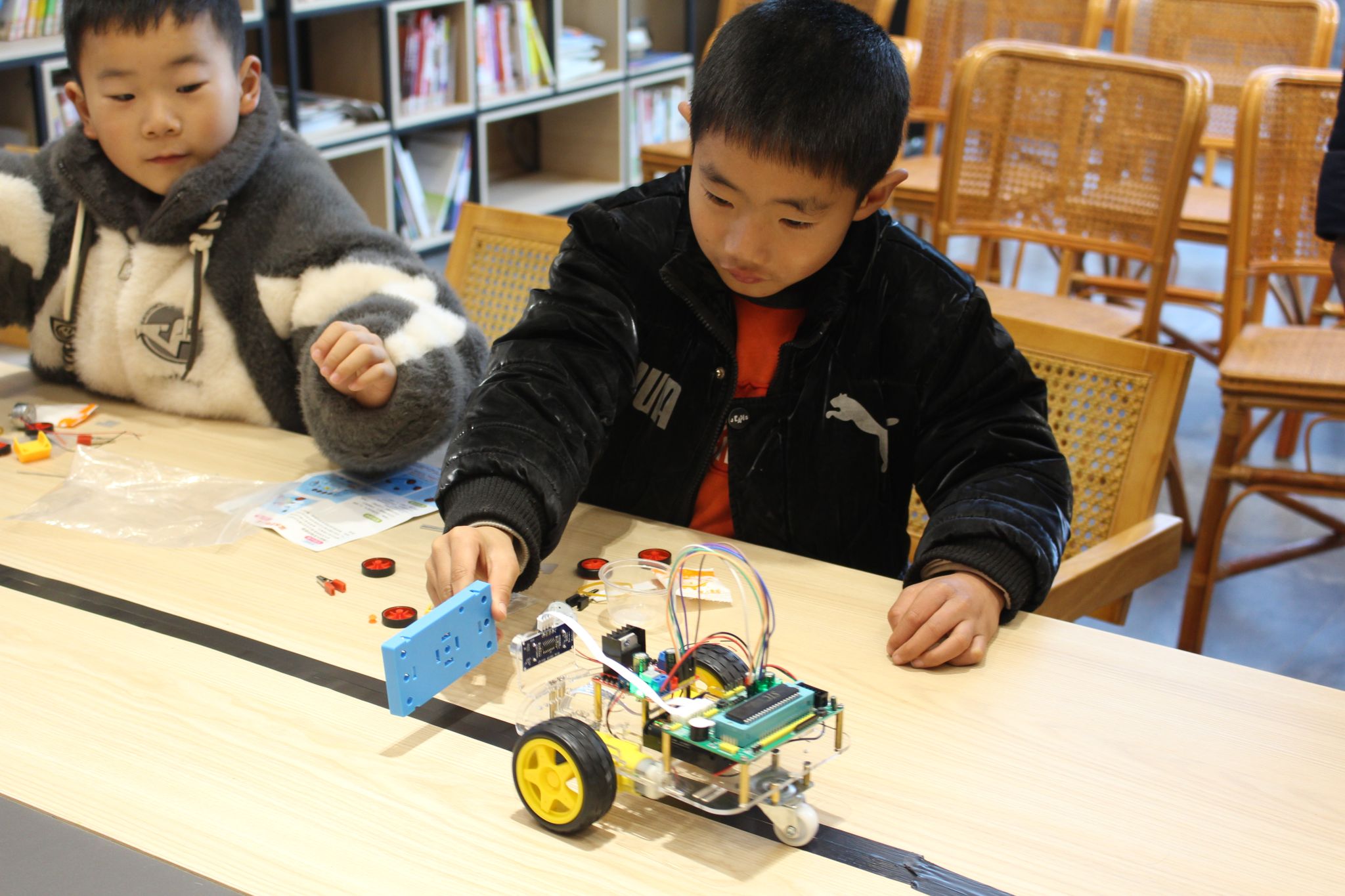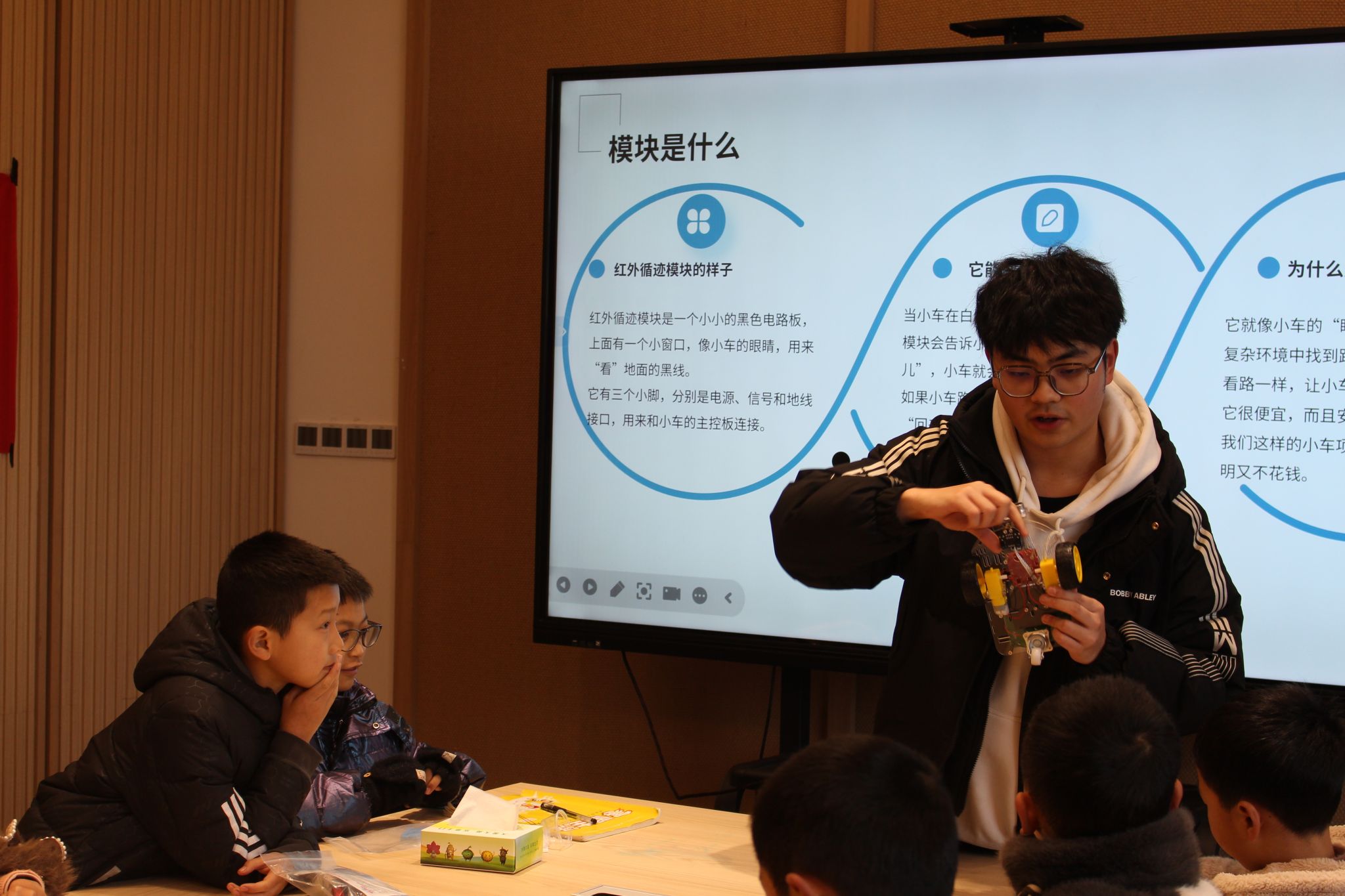 在新工科实践环节,实践队员们充分发挥专业优势,将前沿科技与乡村教育紧密结合,为乡村学生带来了一场科技盛宴。活动中,实践队员们首先向学生们介绍了循迹避障小车的工作原理,通过生动的讲解和现场演示,让学生们直观感受到智能科技的魅力。学生们在实践队员的指导下,动手组装了循迹避障小车的轨道并对小车进行调试,体验科技带来的乐趣。这一过程不仅锻炼了学生的动手能力,也激发了他们对智能科技的兴趣。