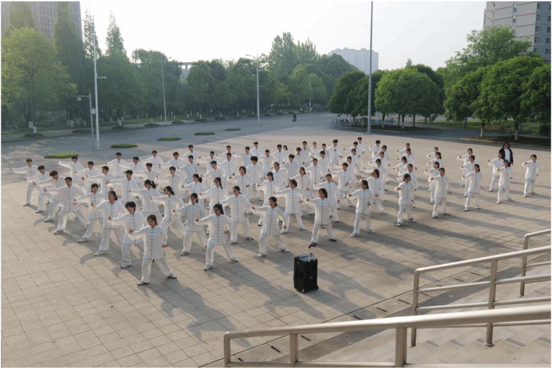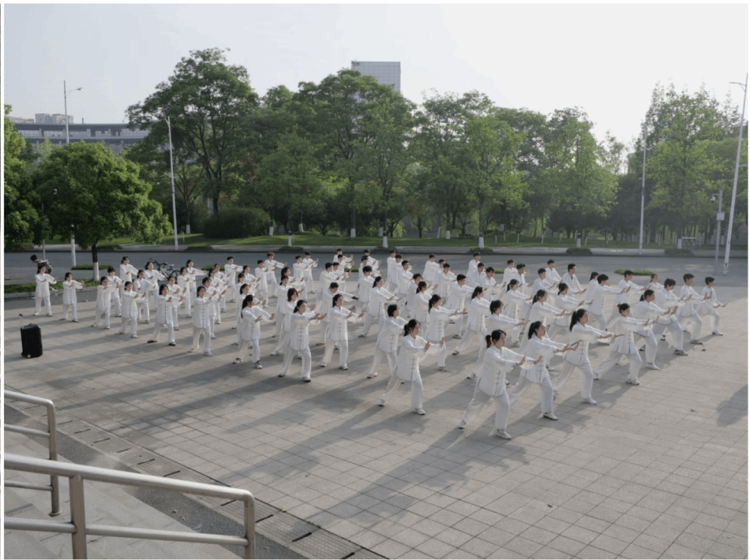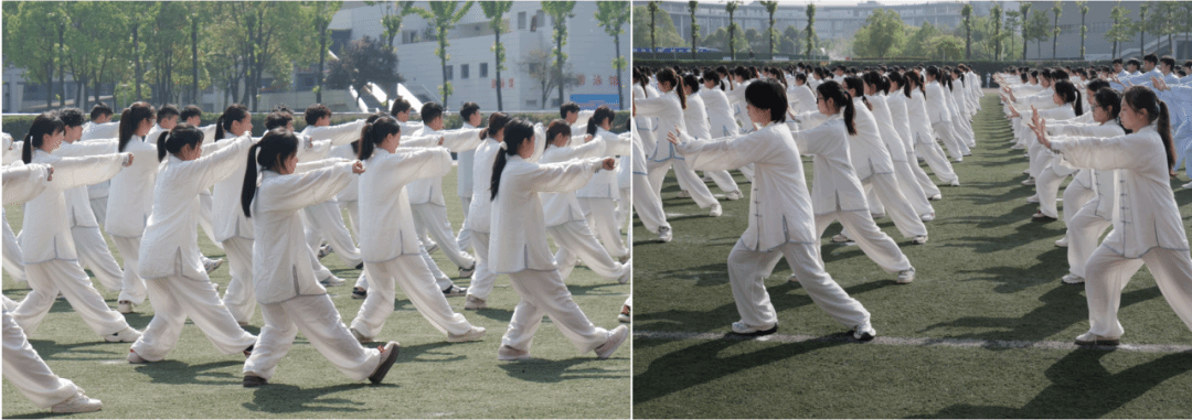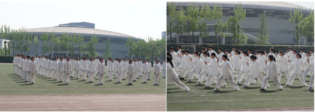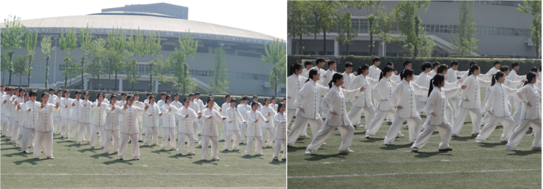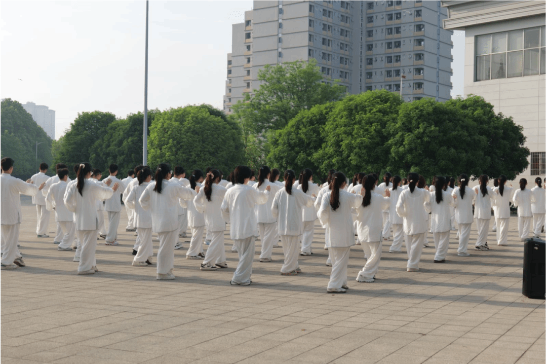 晨风徐吟,素衫轻动。随着音乐响起,同学们姿态轻盈,舒敛自如,从白鹤亮翅,左右倒卷肱,到高探马,双峰贯耳,每一个动作都标准到位,行云流水。一拳一掌,皆柔中带刚,慢中有稳;一招一式,亦形神兼备,姿韵俱存。一套完整而纯熟的太极拳法结束,同学们缓缓垂手站直,完美收势。