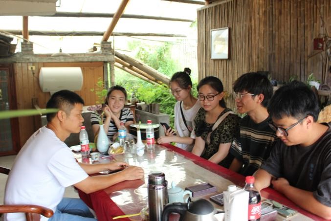 8月11日上午,实践队前往十万坪侗寨沅州石雕传习基地拜访全国五一劳动奖章获得者、国家级非物质文化遗产沅州石雕省级代表性传承人胡杨先生。在现场,队员们观摩胡杨、张小花等人雕刻石雕。在与胡杨交流的过程中,实践队了解到他正在积极对大众宣讲非遗,打造侗寨特色,助力乡村振兴,在基地开展民族团结活动等。
