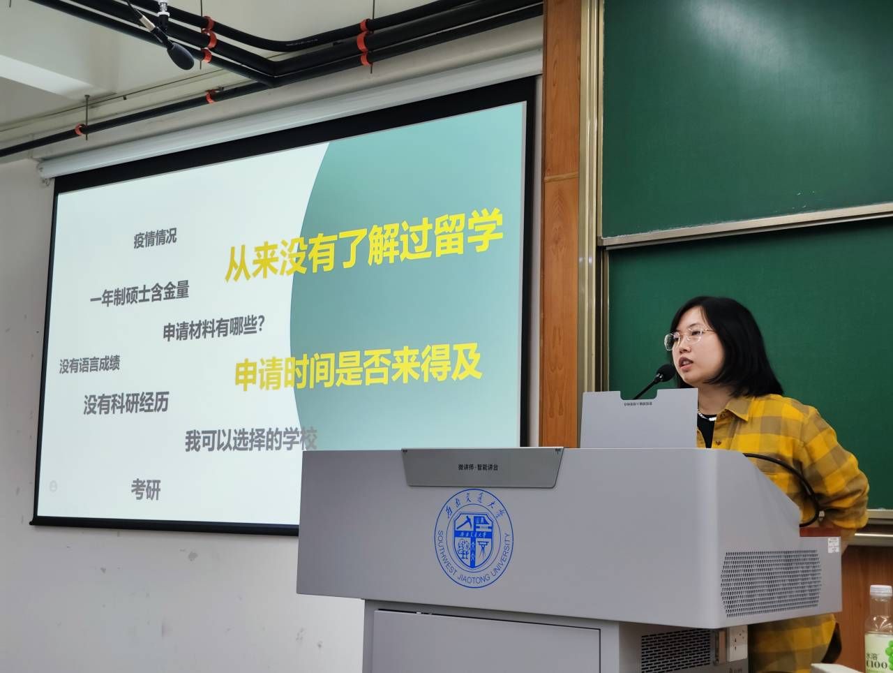 接下来由廖绿依进行留学科普讲座。讲座现场,廖老师通向同学们展示了各大高校的留学率,用数据为同学们详细地讲解了留学的意义和优势,重点解释了如何在众多留学国家中选择适合自己的国家、国外名校硕士生申请的具体要求、国外名校目前就业形势等方面的内容。廖老师还就学生对留学问题的误区予以分析,并详细解答了同学们普遍关心的问题。