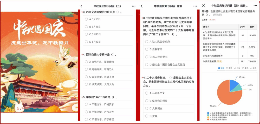 2023年9月29日至10月3日,学生会举办国庆线上知识答题活动。活动中涉及到中国共产党的历史、章程,中国共青团的历史、章程,西南交通大学的校史等多个主题,促进了同学们了解中国共产党、共青团、西南交大的相关知识,激发同学们爱党爱国爱校的热情。本次活动为线上模式,为同学们的假期生活增添了一抹亮色。同学们的答题热情也十分高涨,据统计,超过300名同学参与了此次线上答题活动。