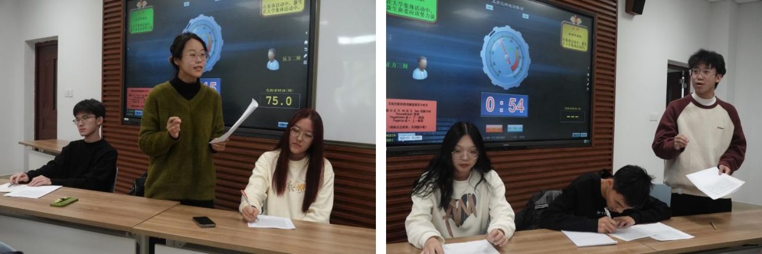 首先,一场生动的辩论表演赛活跃了现场氛围,对“在大学集体活动中,新生班委是否应该说服同学参加集体活动”这一辩题的讨论也引发了全体对于班级建设方面的思考。