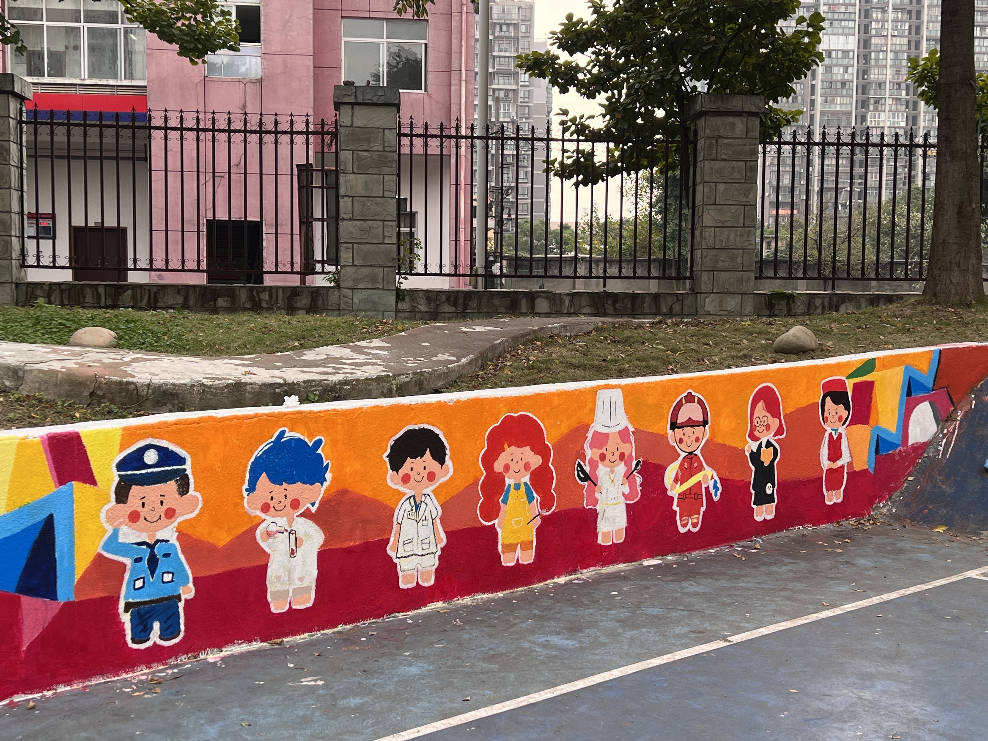 在前期准备时,同学们结合专业知识,融合童年元素,共同完成墙绘图案设计工作。