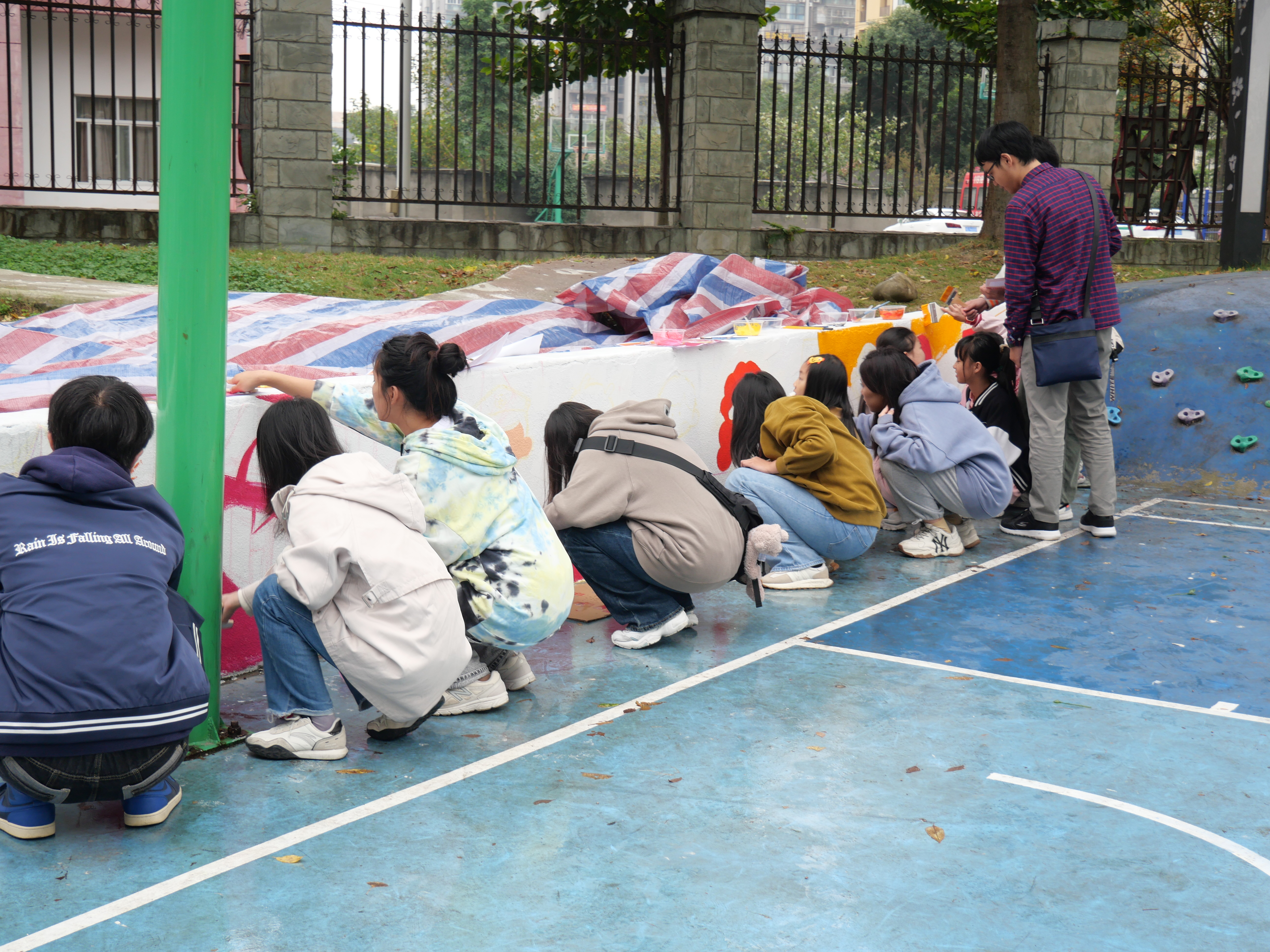在实践过程中,同学们分工明确、井然有序,并在社区工作人员的协助下带领小朋友们共同完成墙绘涂装改造。活动结束后,团支部收到了社区工作人员及参与小朋友们的一致好评。