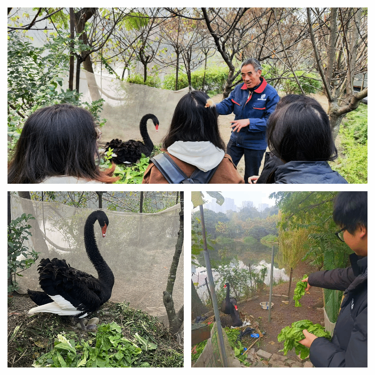 部分学生还在樊师傅的带领下,坐船来到了位于犀湖中心的鹅舍,近距离观察并喂食黑天鹅。在樊师傅的介绍下,学习天鹅的繁殖、迁徙、社交、食性、寿命等相关知识。