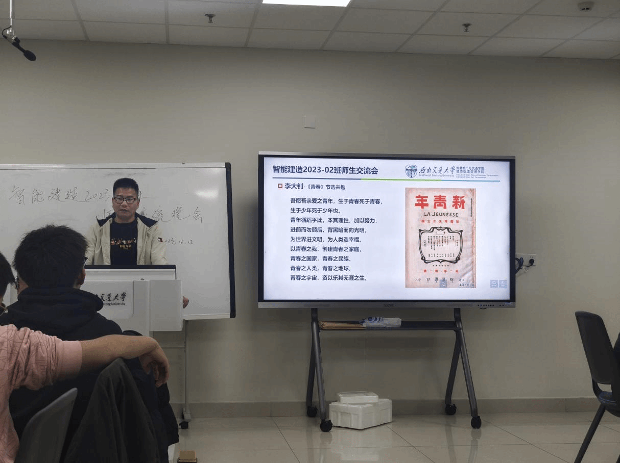 青年讲师团成员、智能建造系教师鲍玉龙,开展以“锤炼奋斗精神,厚植青年担当”为主题的课程,他以李大钊同志的《青春》为展开,告诉同学们回首过去,最可贵的是奋斗;展望未来,最可靠的仍然是奋斗,我辈青年在路上!