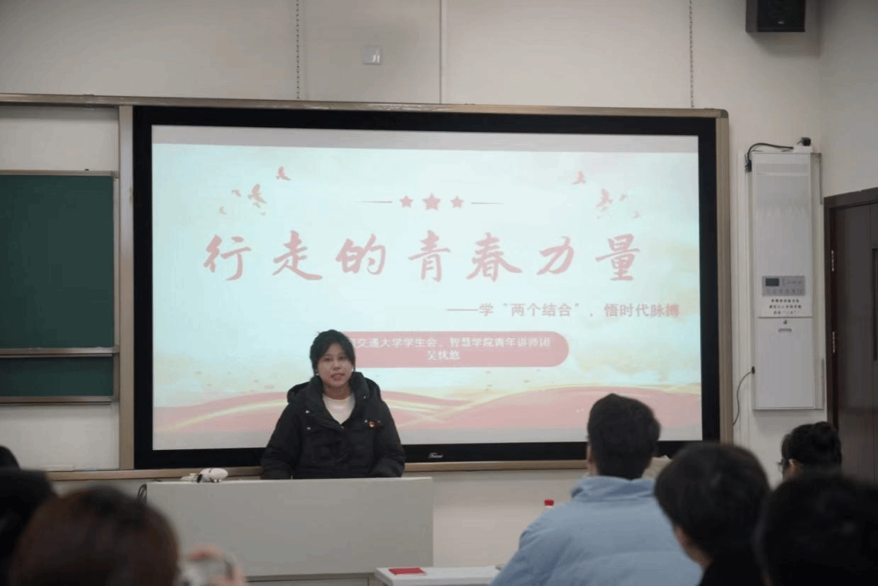 青年讲师团成员、校学生会副主席吴忧悠面向团员和青年开展理论宣讲,从她重温习近平总书记考察足迹的社会实践活动经历出发,并带领青年们深入学习“两个结合”重要思想,号召大家在“行走的思政课堂”中真学、真听、真看、真感悟,以实际行动在强国建设、民族复兴的历史进程中挺膺担当。