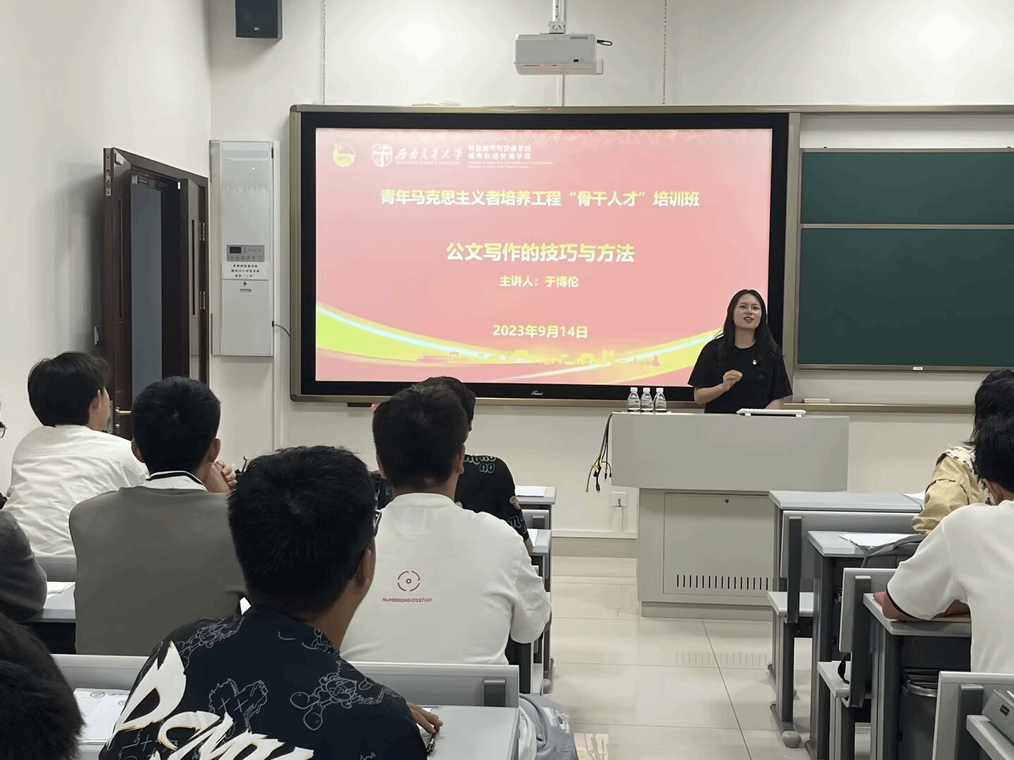 首届“青马工程”骨干人才班培训,主要针对公文写作的技巧与方法开展培训,她以活动策划为引,为学员们从公文的属性开始,讲述公文写作的要领、方法。通过讲解范例,让学员更深入地了解公文写作的规范与要求,并鼓励学员们在以后的学生工作中,像公文写作时一样,从高度、精度、规范的角度出发,将工作做实做好。