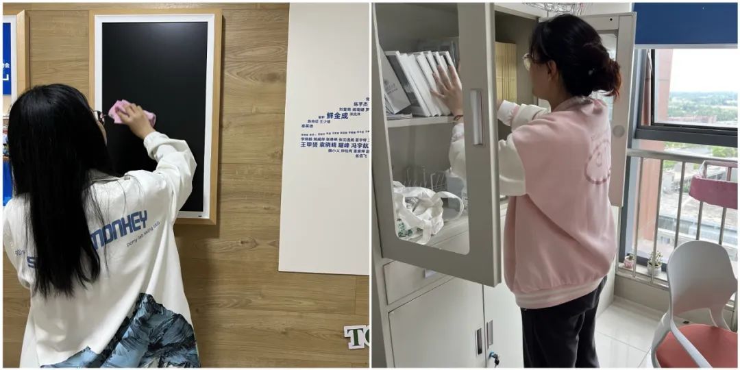 组织办公区域清扫活动,师生共同打扫办公区域卫生,规整实验室物品、归纳仓库物资,为师生提供良好舒适的工作、实验环境。