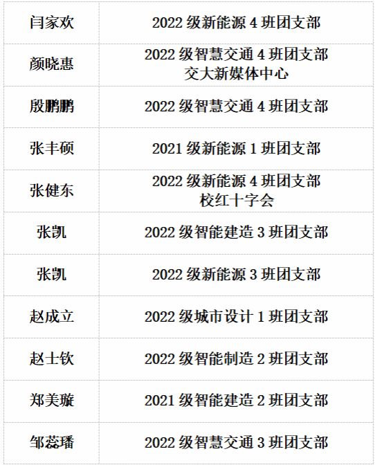 指导的交大科幻协会,在2023成都世界科幻大会上荣获中国科幻最高奖;深入联系青年,链接党组织和青年群体,定期开展“院长下午茶”“书记面对面”“主任工作坊”等活动,为青年办实事、解难题,将党的温暖与关爱传递给青年,严格落实学生会改革要求,充分发挥学生会思想引领与模范带头作用,持续打造靠得住、做得实、立得正的学生会;夯实基础团务,严格落实“三会两制一课”制度,紧抓团员发展质量生命线;不断探索“新工科+”特色模式、将青春、奋斗、担当、进取等主题融入各类团学活动,让学生们看得见、摸得着,从而入脑、入心、入魂、入行。