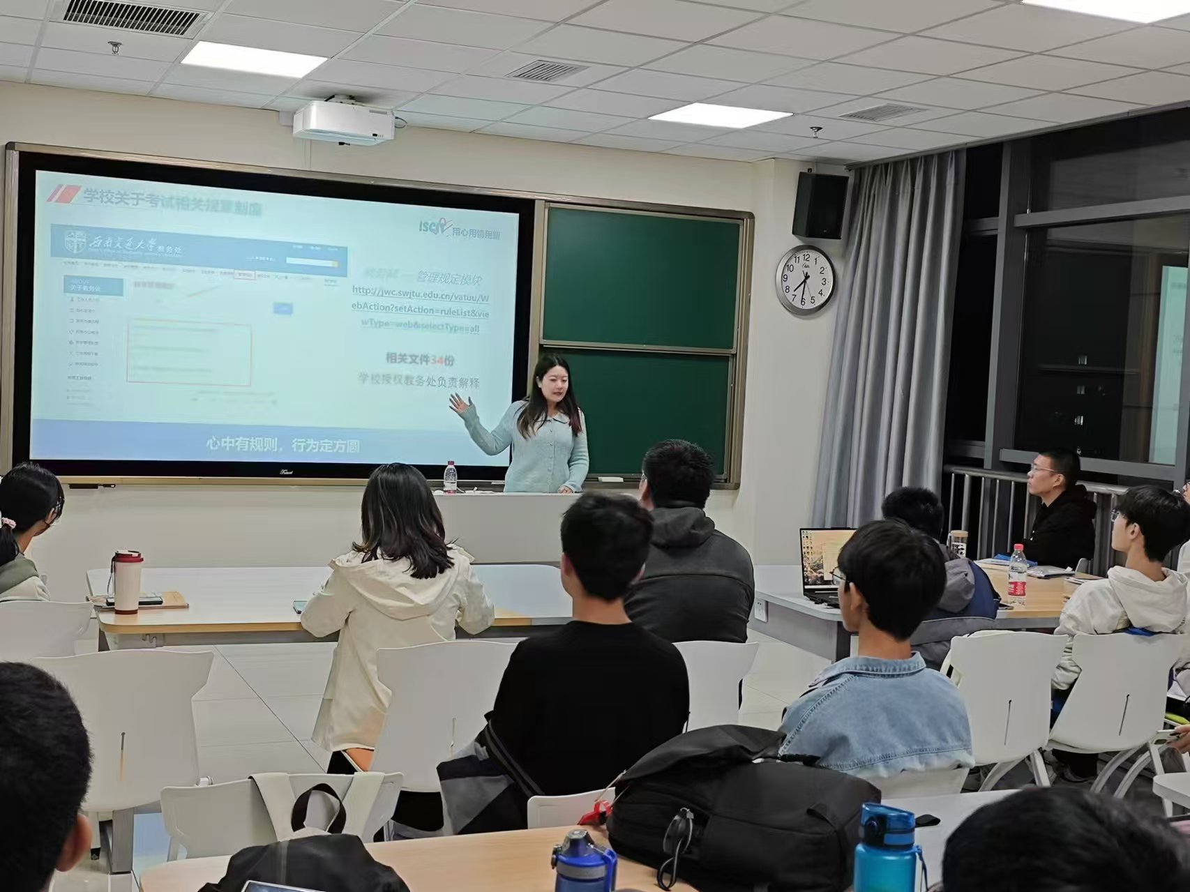 青年讲师团成员赵淑佳老师组织学习西南交通大学本科生相关管理规章制度,帮助新生全面掌握学校各项规章制度,明确学生的责任、权利与义务,同时为新生讲解评奖评优各条例文件,强调评奖评优规定。随后她从“网络素养及其特征”、“大学生网络失范行为与案例分析”及“如何提升网络素养”三个方面为新生开展网络素养教育专题讲解。