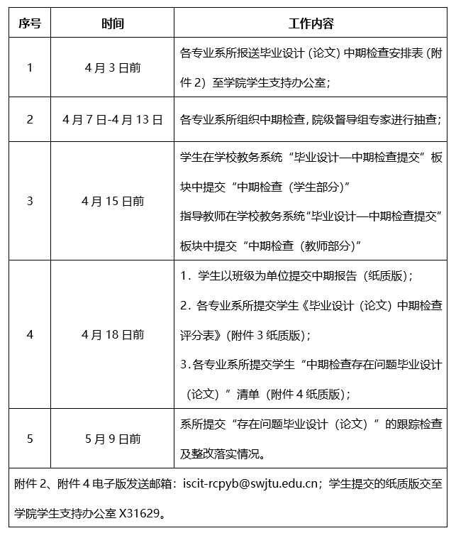 学生支持办公室([email protected]),并将结果反馈给指导教师,督促学生进行整改。各专业系需对“中期检查存在问题毕业设计(论文)”进行质量跟踪,于5月9日前提交跟踪检查及整改落实情况。