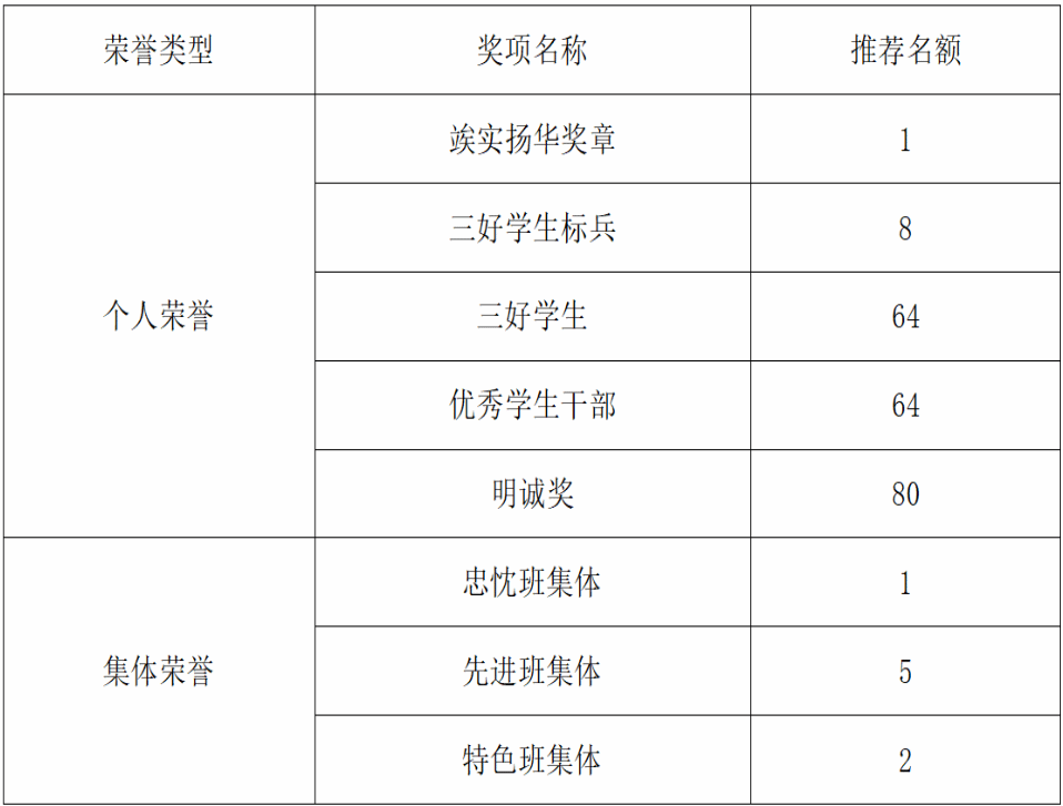 个人荣誉称号包含:竢实扬华奖章、三好学生标兵、三好学生、优秀学生干部、明诚奖,评选条件详见《管理办法》。