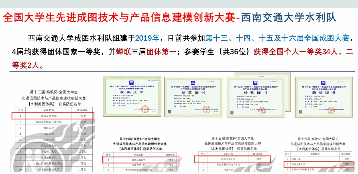 全国大学生先进成图技术与产品信息建模创新大赛是中国教育部及西南交通大学认证的A 类学科竞赛。西南交通大学水利队连续参加了第十三至十六届先进成图大赛,成绩如下: